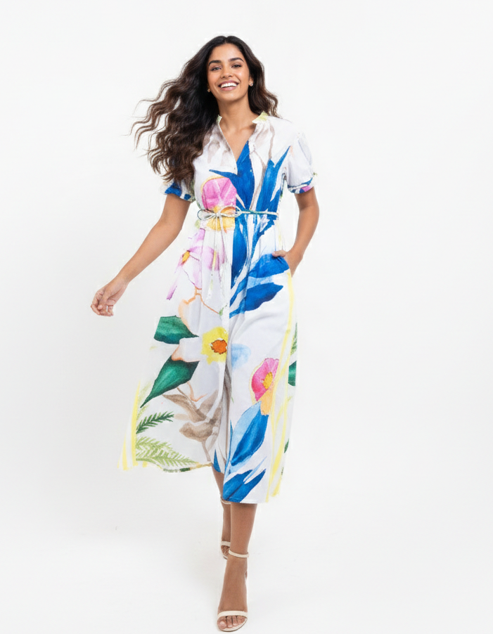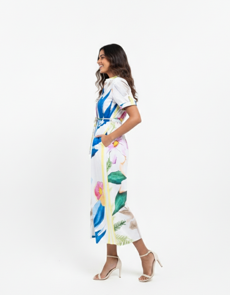 Multicolour florals + belted waist – white cotton midi sculpt.