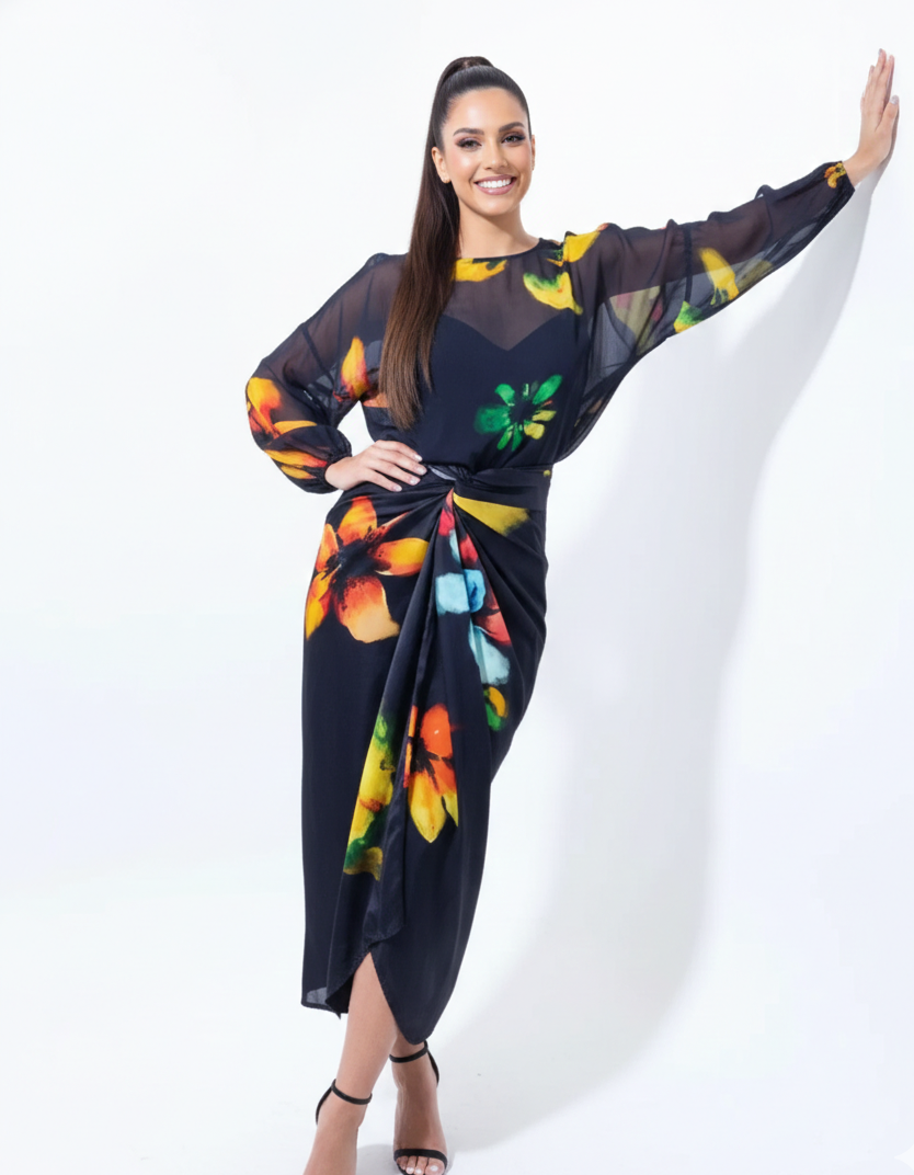 Deep navy-black foundation blooms in orange, pink, green floral vibrancy – 100% drape-vegan silk that cascades in high-low asymmetry for striking movement. Long sleeve-like volume pairs as standalone or with fitted tops.